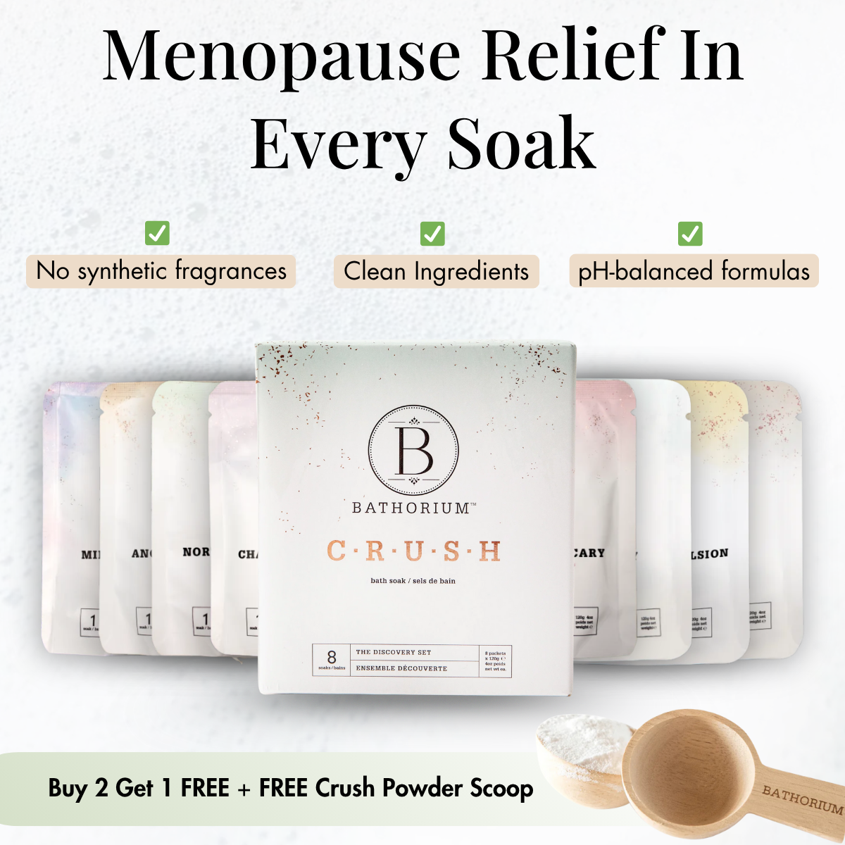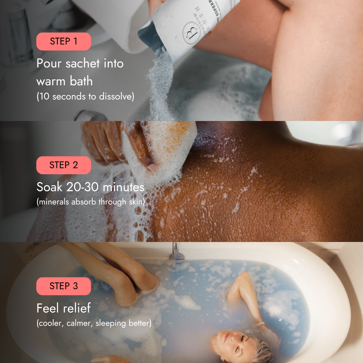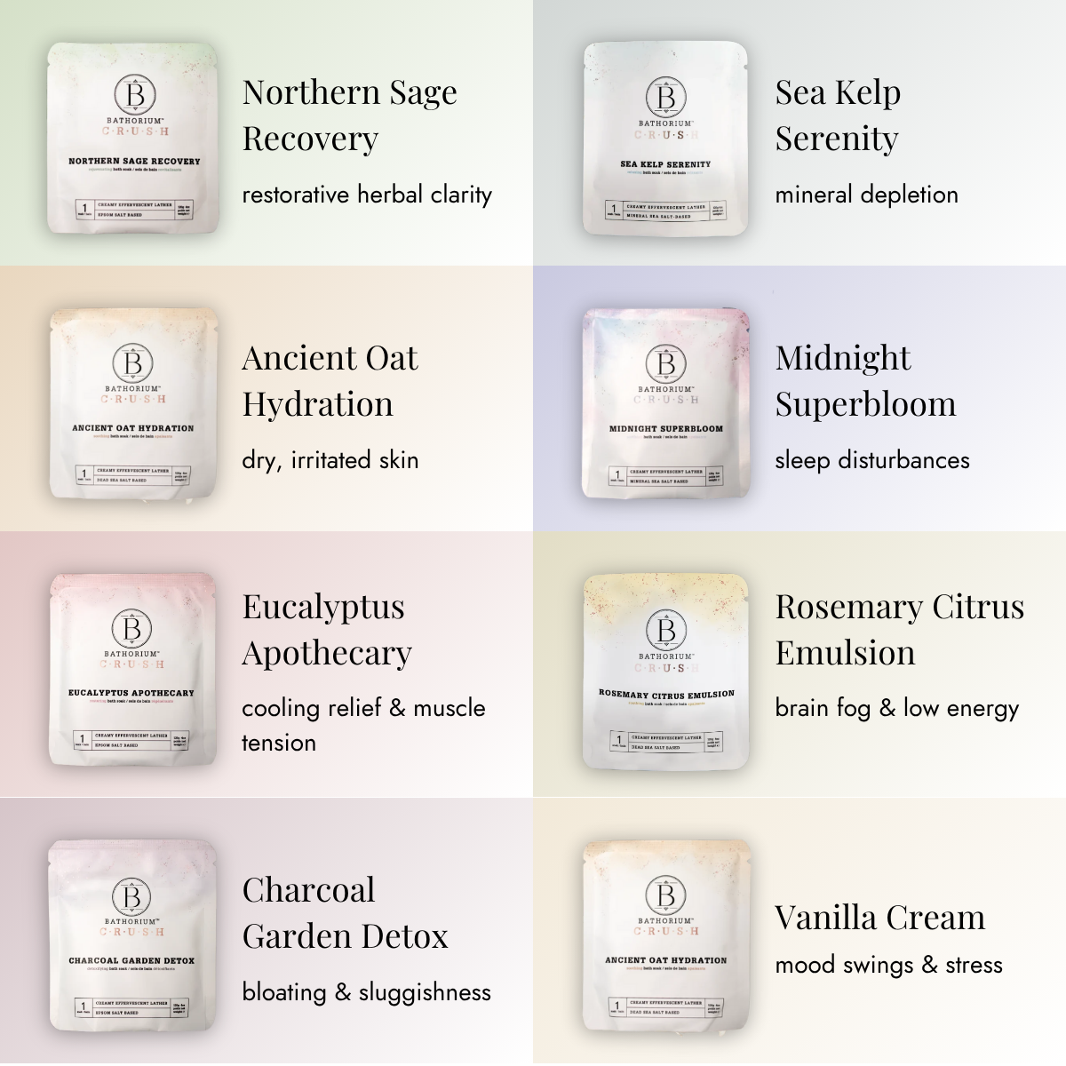 The result: eight pH-balanced, magnesium-rich soaks designed to care for the body through perimenopause and menopause — without synthetic fragrance, harsh surfactants, or unnecessary additives.